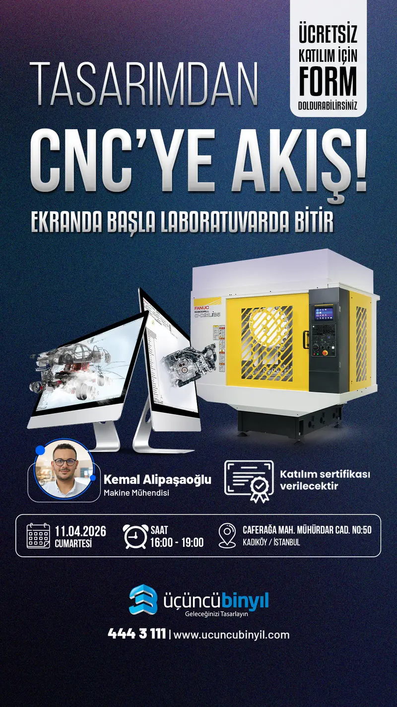Üçüncü Binyıl Akademi Makine Laboratuvarı’nın kapılarını gerçek bir üretim deneyimi için aralıyoruz! Tasarımın imalata dönüştüğü o sihirli ve disiplinli dünyaya adım atın; sıfırdan bir tasarımın CNC Freze tezgahında nasıl işlendiğine tanıklık edin.
